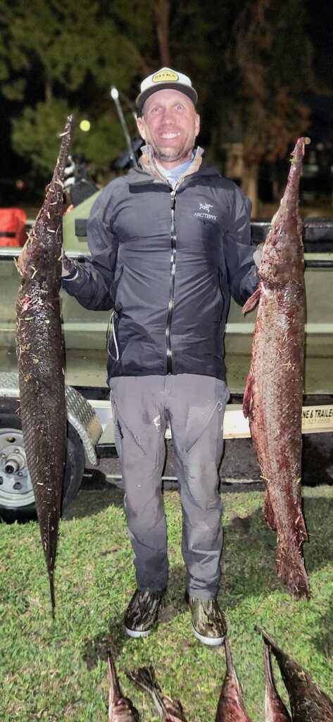 Day trips are only in the Gulf, I don't do daytime freshwater currently. Mullet, Sheepshead, Black drum, Longnose Gar, and the wonderful tasting Stingray are plentiful and offer a target rich environment.